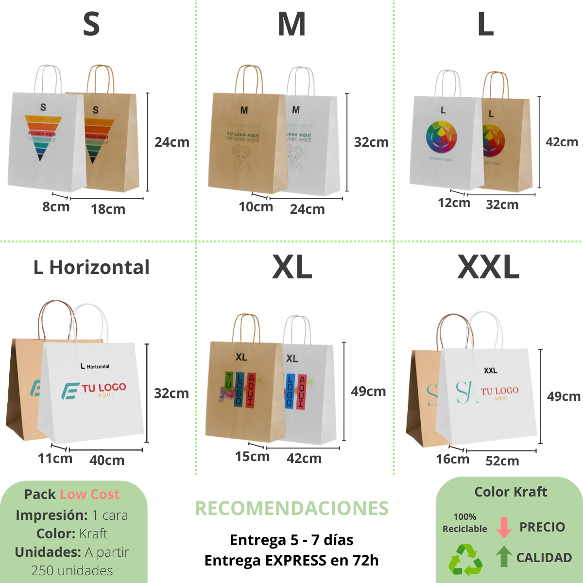 • Grosor: Bolsas de papel con un grosor superior. Bolsa blanca 100gr, Bolsa marrón kraft 115 gr.